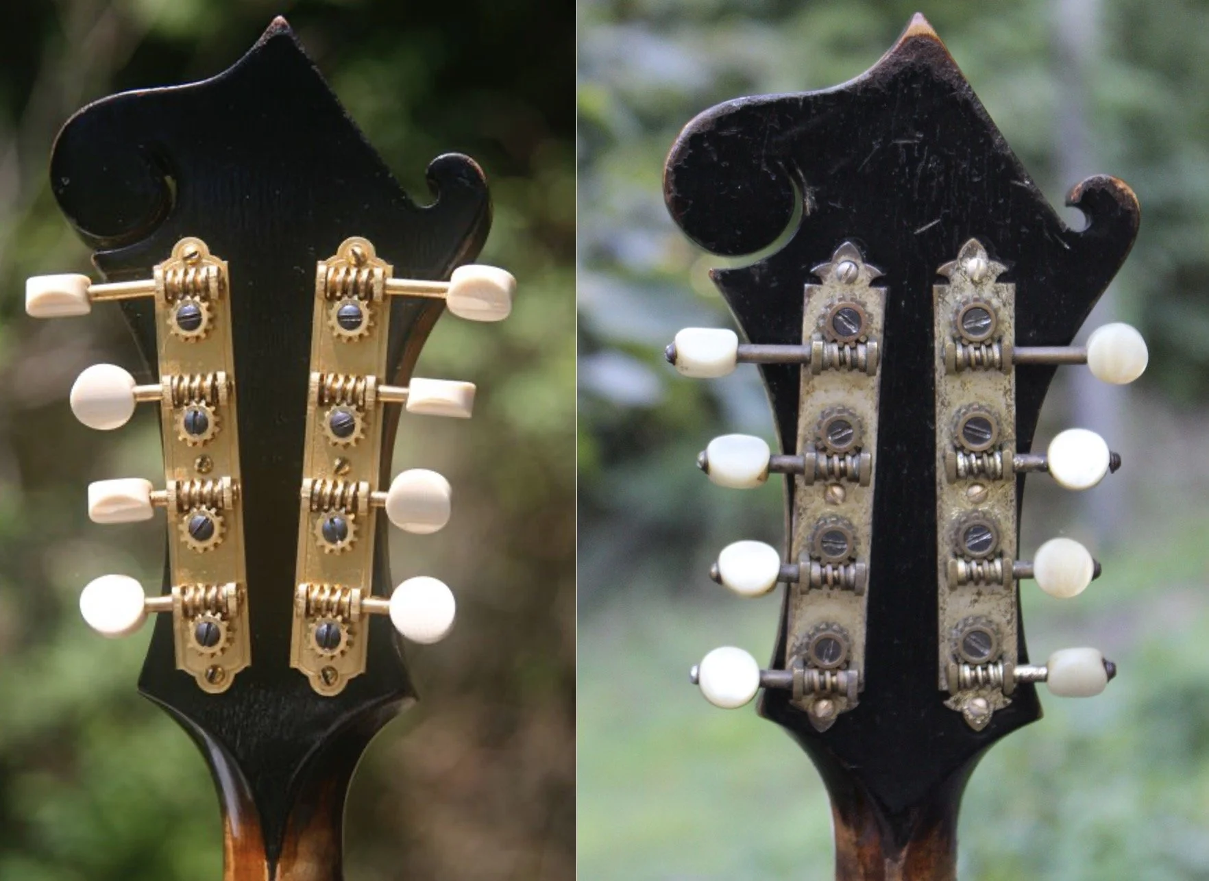 Left: Back of peghead of F5 79719 with the prototype Grover tuner; right: back of peghead on 79641 with the standard Waverly tuner. Notice the cog (round gear) of the Grover tuner is below the worm gear. When the button turns the shaft of the worm gear, the cog turns the string post to tighten or loosen the string. The issue with the Waverly tuner was that the string tension tended to pull the gears away from each other,; by reversing the position of the gears, turning the post tended to pull the gears together.